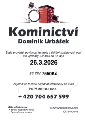 Kominictví Urbášek bude v naší obci dne 26.3.2026 provádět povinnou, každoroční kontrolu a čištění komínů a spalinových cest, od spotřebičů na pevná a plynná paliva.