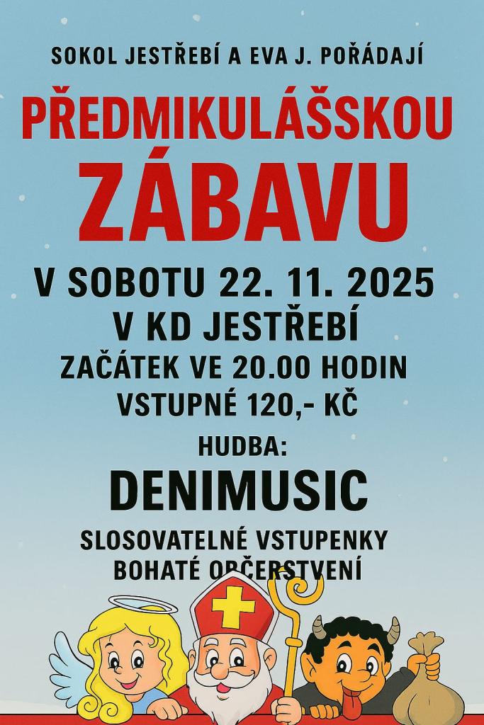 Sokol Jestřebí a Eva J. pořádají v sobotu 22.11.2025 Předmikulášskou zábavu v KD Jestřebí.