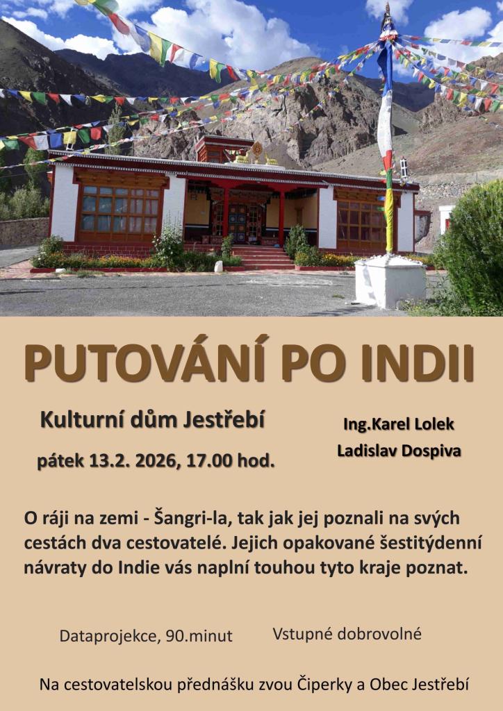Čiperky a Obec Jestřebí zvou na přednášku cestovatelů Ing.Karla Lolka a Ladislava Dospivy o jejich putování po Indii v pátek 13.2. v KD Jestřebí od 17:00