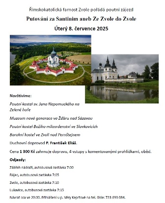 Římskokatolická farnost Zvole pořádá poutní zájezd v úterý 8.července 2025. Přihlášení u p. Věry Keprtové na tel. čísle: 723 693 084.