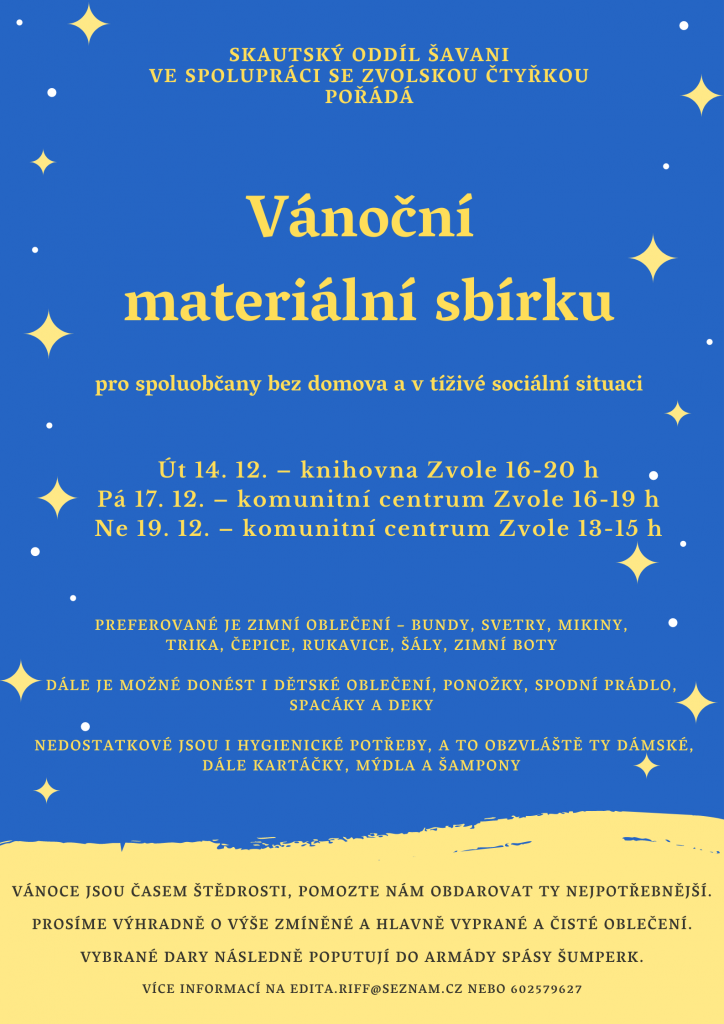 Skautský oddíl Šavani ve spolupráci se Zvolskou čtyřkou pořádají vánoční materiální sbírku pro spoluobčany bez domova a v tíživé sociální situaci